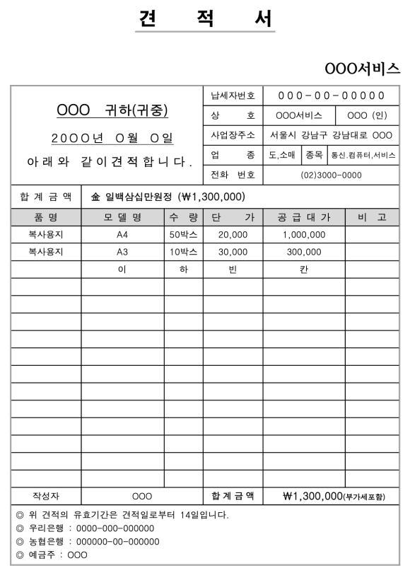 견적서에는 사업자 정보가 들어가는데, 상호, 주소, 대표자, 대표자 도장 등 기본적인 항목들이 누락되거나 혹은 오타 등으로 틀렸을 경우 비지니스 매너에 어긋날 수 있습니다.