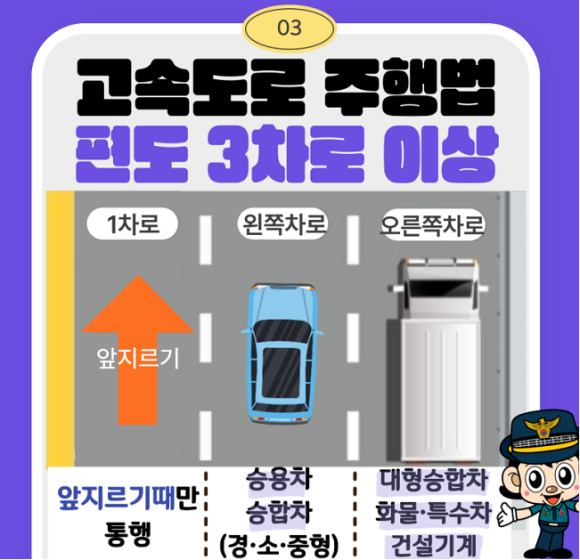 3차로의 경우에도 마찬가지로 왼쪽 1차로는 앞지르기를 하는 자동차만 허용되고, 2차로는 승용,경형,소형,중형 승합자동차, 3차로는 대형차가 운행해야 합니다.