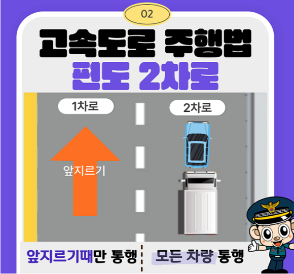 왼쪽 1차로는 앞지르기를 하려는 자동차만 허용되며, 2차로는 모든 자동차가 운행가능합니다.