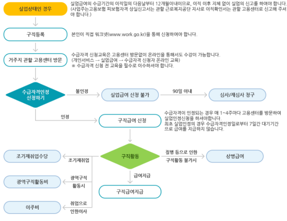 - 수급자격 인정 시 재취업활동을 하면서 구직급여 수혜. 매1~4주마다 고용센터 방문 또는 인터넷으로 실업인정1) 신청