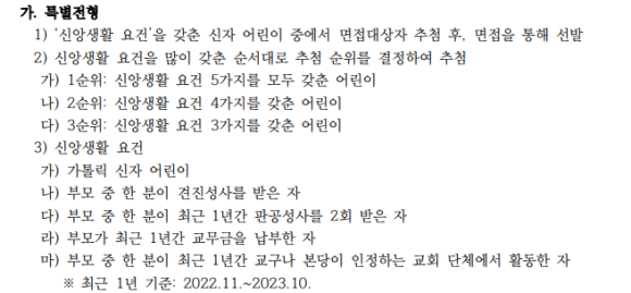 살레시오 초등학교는 특이하게 신앙생활 특별전형이 있습니다. 가톨릭 신자라면 신앙생활 특별전형으로 지원해봐도 좋을 것 같네요.