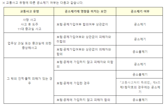 그 밖의 교통사고의 경우에도 보험가입여부, 피해자 합의 여부에따라 공소불제기 되는 경우도 있습니다.