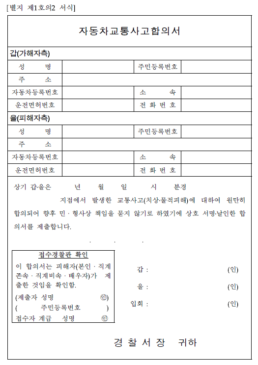 따라서, 교통사고 합의서 양식을 작성할 때는 민사상, 형사상의 합의까지 정확하게 해야합니다.