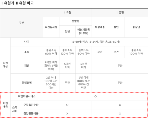 취업을 원하는 청년, 장기실업자, 경력단절여성, 저소득 구직자, 특수형태근로종사자 등 취업취약계층으로 인정되는 사람들을 대상으로 하되, 참여자의 소득과 재산에 따라 2가지 유형으로 구분되어 있습니다.