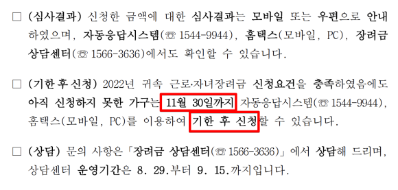 그래서 혹시 대상이 되는데, 근로장려금은 못 받았다면 11월 30일까지 기한후신청을 꼭 하셔야 하고 이 기간이 넘어가면 받을 수 없습니다.