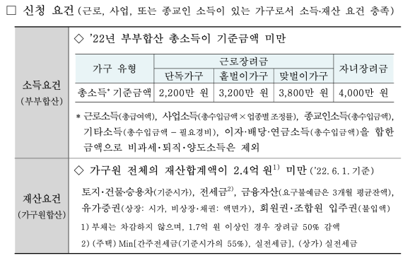 근로장려금은 작년에 일을 했으나, 소득과 재산이 적어야 합니다.