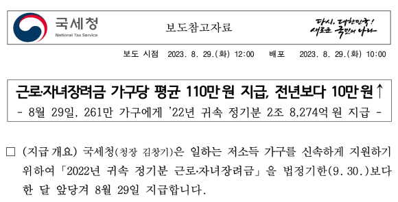 이번 8월 29일에 지급된 근로장려금은 22년 귀속 정기신청분입니다.
