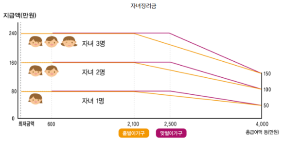 구분총 소득기준금액최대지금액홑벌이가구4,000만원 미만자녀 1인당 80만원맞벌이가구