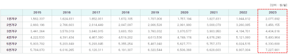 가구수2024년1인가구2,228,4452인가구3,682,6093인가구4,714,6574인가구5,729,9135인가구6,695,7356인가구7,618,369