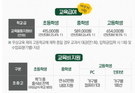 - 교육급여 : 기준 중위소득 대비 50% 이내 가구