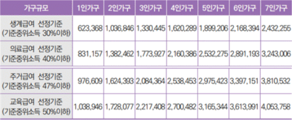 - 생계급여 : 기준 중위소득 대비 30% 이내 가구