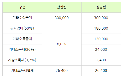 기타소득세를 간편하게 8.8% 계산하는 결과와 필요경비 까지 감안해서 정석으로 계산하는 결과값은 아래처럼 동일합니다.