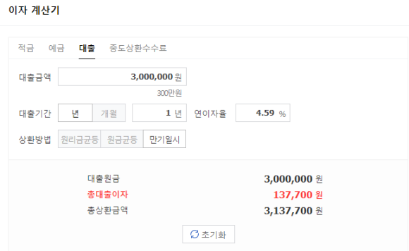 지원 대상이 되서 최초 300만원(최대 500만원)을 대출 받을경우 1년동안 내야할 이자는 약 137,760원이고, 12로 나누면 1달 이자는 약11,480원입니다.