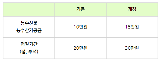- 농수산물, 농수산가공품 : 10만원(명절에는 20만원) → 개정