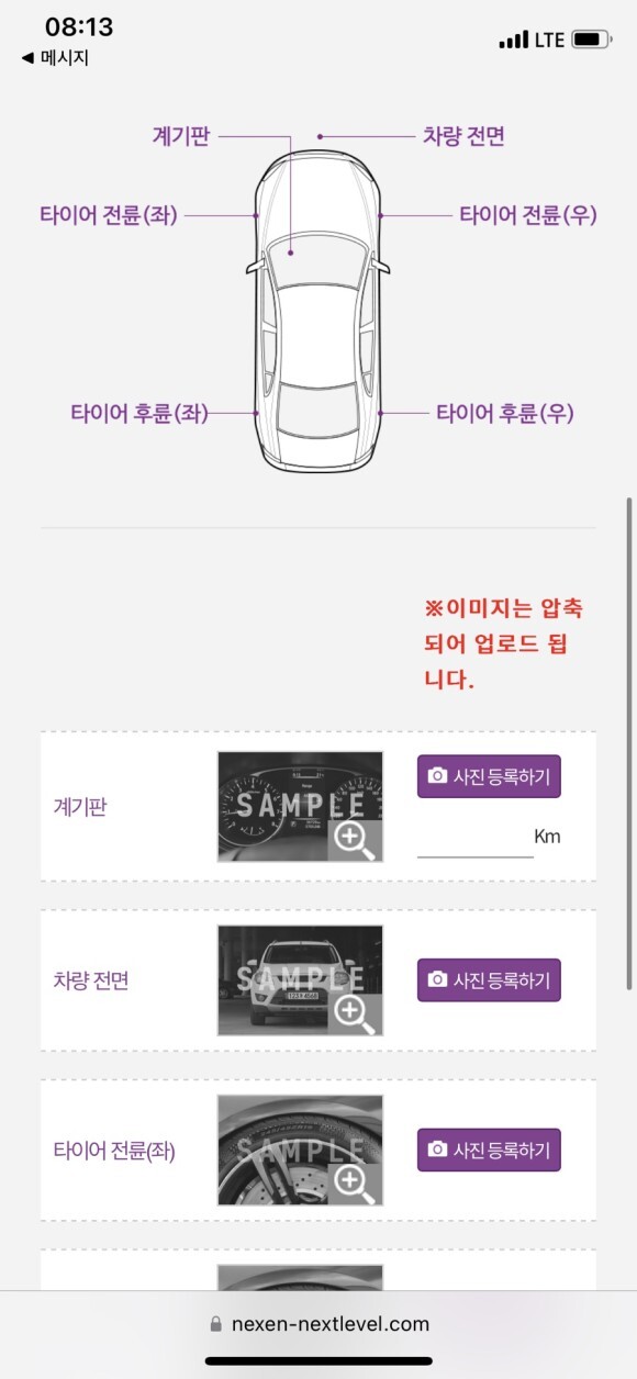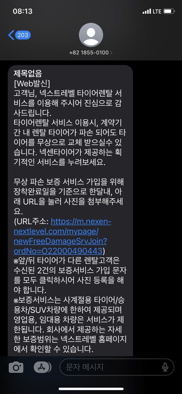 정상교체 후에 넥스트레벨에서 문자가 또 도착했습니다. 계기판, 차량 전면, 타이어 교체 사진을 등록하면 무상 파손 보증 서비스에 가입이 됩니다. 문자로 온 주소를 눌러 사진을 찍고 등록하면 됩니다.