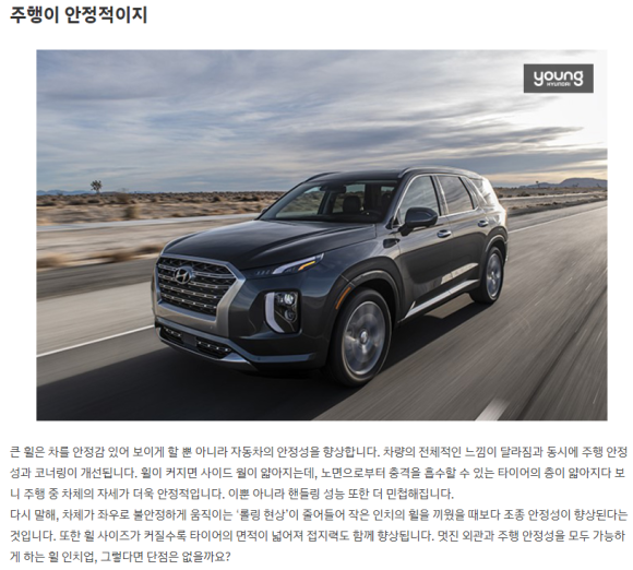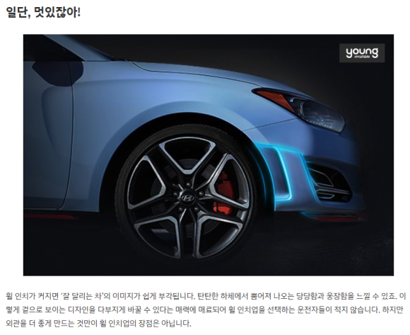 차량을 구매할 때 휠 사이즈를 선택할 수 있는데 휠이 크면 차가 일단 이쁘고 안정감이 높아진다는 장점은 있으나 비용이 많이 들고 연비가 떨어지는 단점도 있습니다.