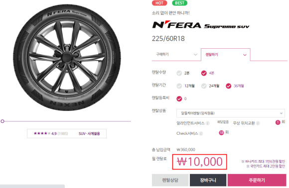 저는 225/60R18 슈프림suv 타이어 4개를 선택하고 기간은 3년(36개월)로 설정했습니다. 렌탈가격은 최초에는 1개월에 2만원이었는데, 주변에 넥센 임직원이 있어서 50% 할인을 받았습니다