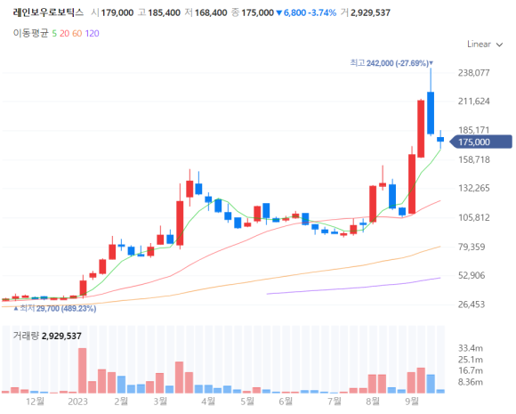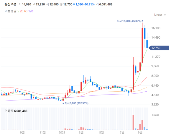 23년 초 상승 이후 다소 하락했었지만, 9월 들어서면 또한번의 큰 상승이 있었습니다. 다른 로봇관련주와 비교 했을때 3분기 시세 상승이 상당히 큰 모습인데요.