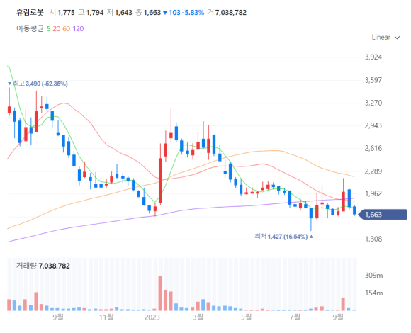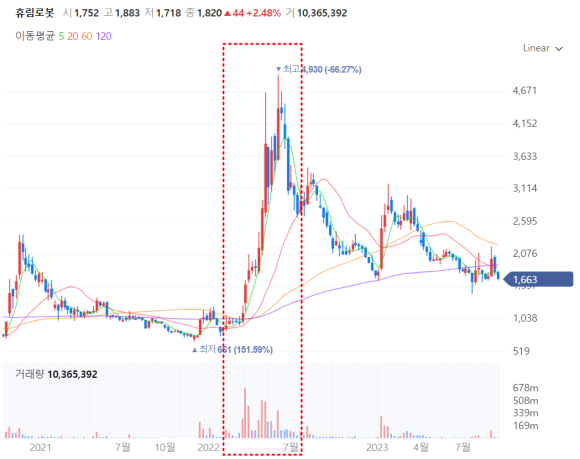 주관적인 생각이지만, 휴림로봇은 2022년 폭등으로 이미 가격에 거품이 껴있었고, 그 때문에 현재 거품이 빠지고 있는 모습이 아닐까? 라고 생각했습니다.
