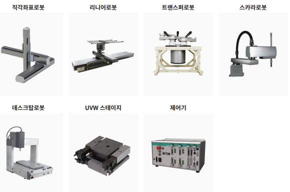 동사가 생산하는 제조업용 로봇은 직각좌표로봇, 수평다관절로봇, 데스크탑로봇, 반도체용로봇, 리니어스테이지 등이 있습니다.