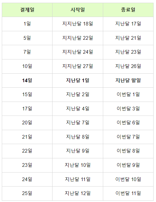 개인적으로 결제일 14일을 추천하는 이유는 이용기간이 지난달 1부터 말일까지 산정되기 때문입니다.