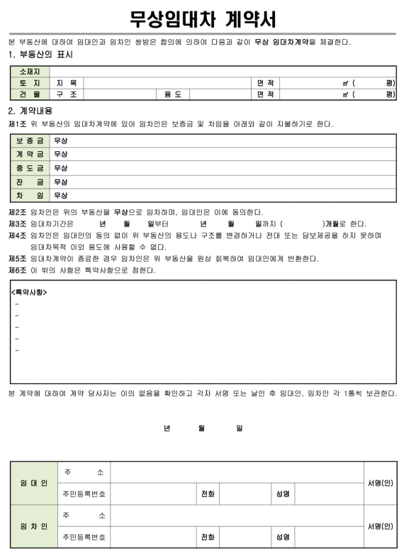 그러나, 무상임대차의 경우에는 특수목적에 따라 계약을 체결하는 사항이므로 표준 서식이 별도로 없지만 민법에 따른 계약사항이므로 특약을 추가해도 무방합니다.