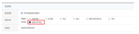 - 홈페이지 중앙 접종증명서 발급 클릭