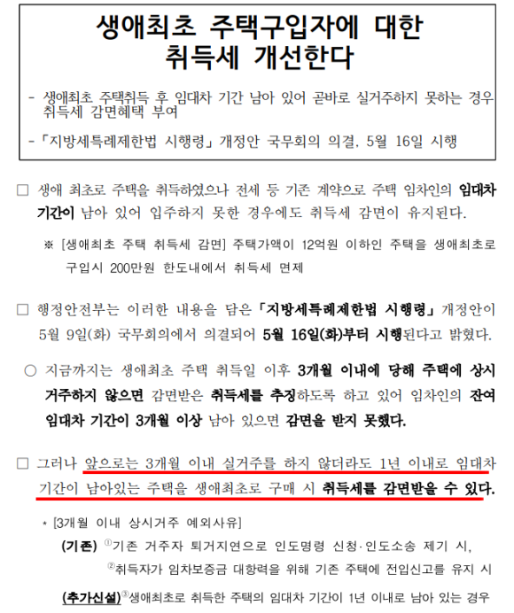 조건은 심풀합니다. 단, 주택을 매입하면서 기존 임대차 기간이 1년 이내로 남아 있는 경우 입주하지 못했을때 취득세 감면받을 부분이 추징됐었는데, 5월 16일부터 개정안이 시행됐습니다.