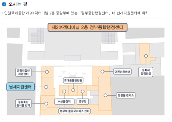 인천국제공항 제2여객터미널 2층에 있는 정부종합행정센터 내 납세지원센터를 이용하면됩니다.
