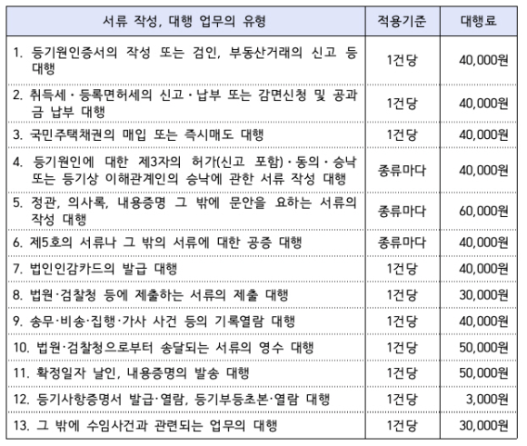 그 밖에 서류 발급, 서류 제출, 기타 업무는 건당 3만원씩 비용이 발생하고요.
