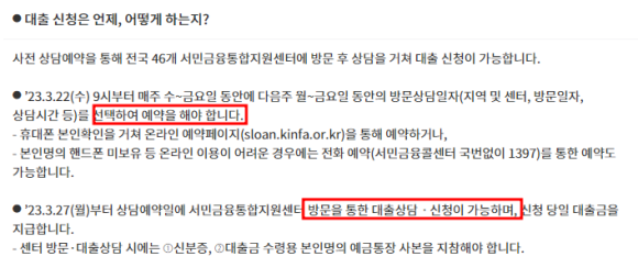 유의할 점은, 이번에 시행하는 소액생계비 대출은 ▶사전예약 후 ▶센터를 직접 방문 해야 실행이 가능합니다.