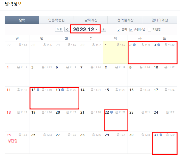 양력일음력일요일12월 2일11월 9일금12월 3일11월 10일토12월 12일11월 19일월12월 13일11월 20일화12월 22일11월 29일목12월 31일12월 9일토22년 11월 음력은 30일이 없고 29일까지 밖에 없습니다. 22년 12월의 손없는날은 총 6일입니다.