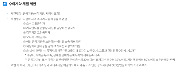 이해충돌 방지법이 22년부터 시행되어서 수의계약할 때 조건이 조금 더 까다로워졌습니다.