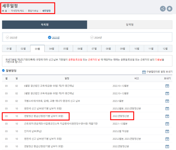 국세청에서 발표 있는 연말정산 세무일정을 살펴보면 3월 10일까지가 연말정산 환급신청 기간입니다.