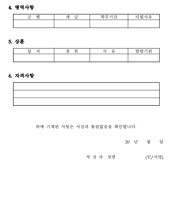 남성의 경우 군필자를 요구하는 곳도 있습니다. 군 경력도 소중한 경력이 됩니다. 이력서의 서식에 병역사항이 없다면 문서 편집을 통해 추가로 적는것도 팁이 될 수 있습니다.