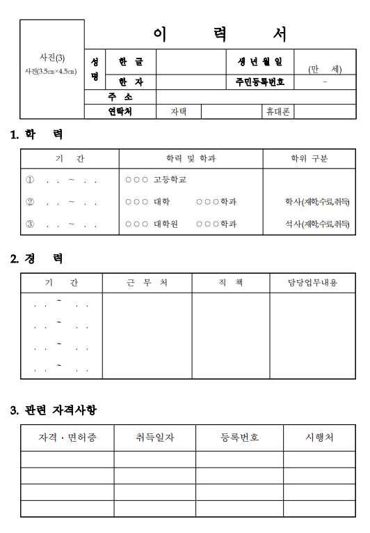 이력서는 법에서 정하고 있는 양식은 없습니다.