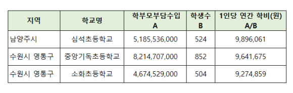 경기도 사립초등학교 학비는 3개학교가 비슷한 수준입니다.