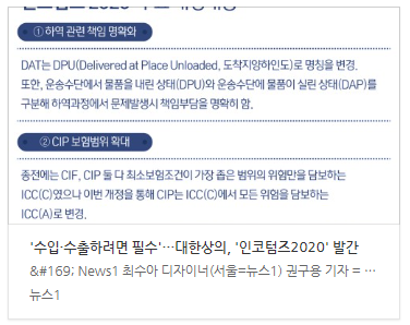 무역을 하게 되면 파는사람(셀러-수출업자)와 사는사람(바이어-수입업자) 당사자끼리 계약을 맺게 되는데, 이때 위험과 비용을 어디까지 누가 부담할것인가를 표준화해 놓은 11가지 조건입니다.