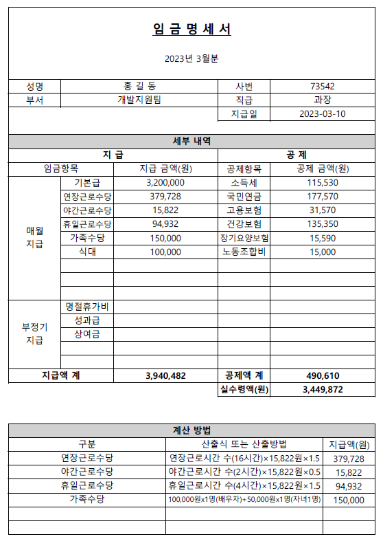 또한, 각종 수당 금액이 어떻게 산출되었는지 계산방법도 표기해야 합니다.