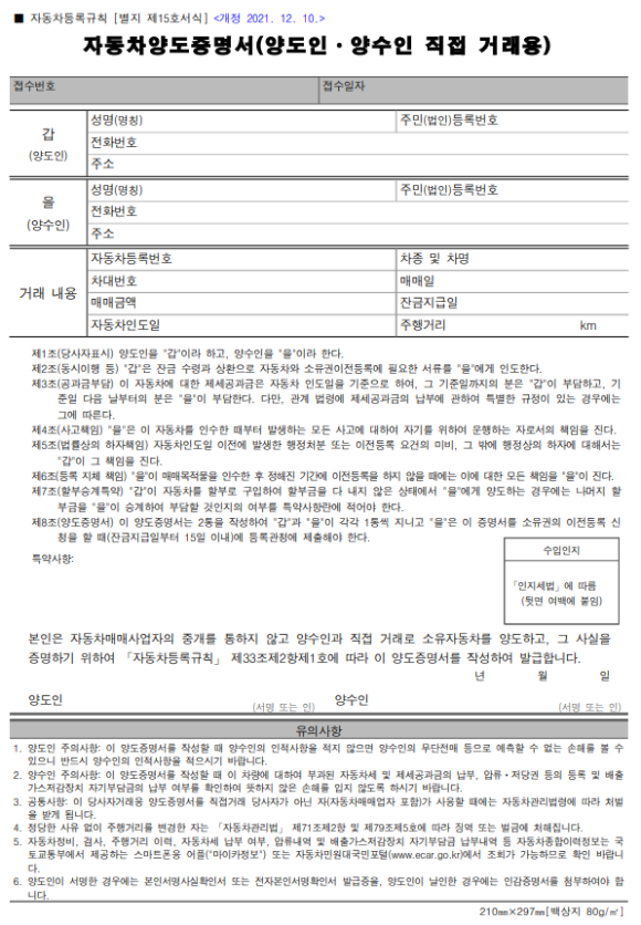개인간 혹은 중고차매매상과 차량거래를 할 때