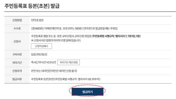 시.군.구/읍.면.동 사무소에 직접 방문하는 방법입니다. 이 경우 신청수수료 1통(400원)와 신분증만 챙겨서 방문하시면 됩니다.