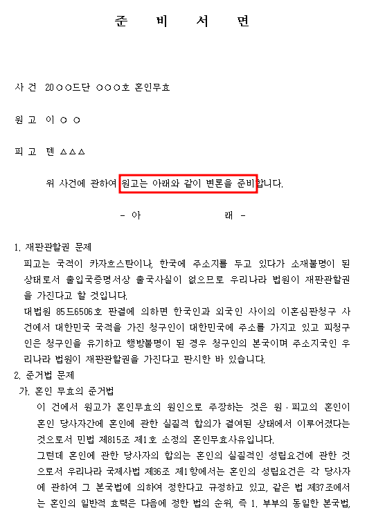 - 준비서면 : 변론기일(재판일) 전에 변론을 준비하면서 법원에 추가로 제출하는 문서