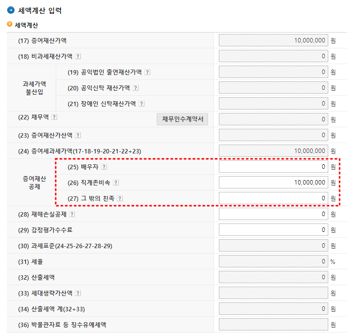 누구에게 증여받았는지에 따라 해당 항목에 금액을 입력해주시면 알아서 공제되니 참고하세요.