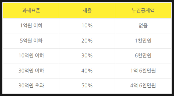 1억이하 증여의 경우 세율은 10% 이지만, 30억원을 초과하는 금액에 대해서는 50% 세율이 적용됩니다. 즉, 증여받은 금액에 절반을 납부해야 한다는 뜻이죠.