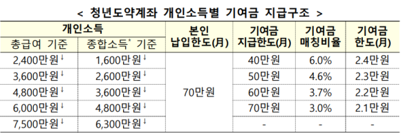 개인소득 2,400만원 이하인 가입자는 월 납입금 40만원 한도로 6% 기여금 매칭비율이 적용되어 월 최대 2만 4,000원(연간 최대 28만 8,000원)까지 지원받을 수 있습니다.