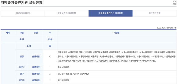 23년 3월 기준으로 전국 출자출연기관은 총 856개입니다.