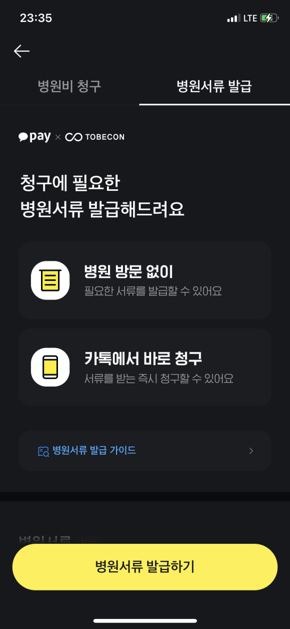 카카오페이와 미리 사전에 제휴된 병원에서 진료를 받았다면 별도의 서류 없이 카카오페이 어플을 통해 바로 신청할 수 있습니다.