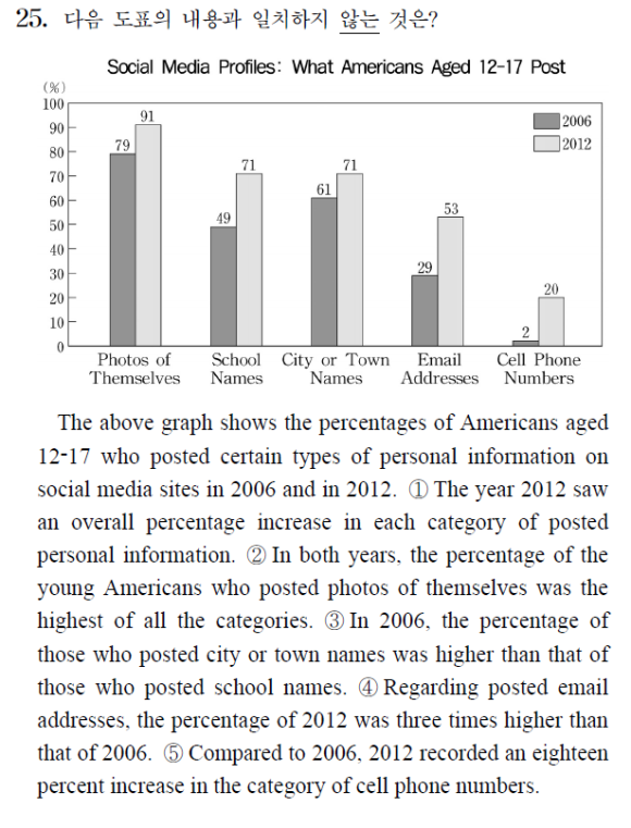 15학년도 영어는 퍼센트 %와 퍼센트 포인트 %p구분이 정확해야 하는데, p(포인트)하나때문에 오류 인정된 문제입니다.