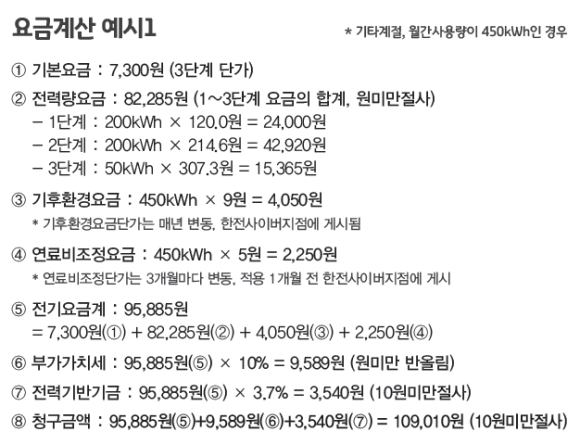 저압용으로 기타계절 월 450kw를 사용했을 경우 최종 109,010원이 청구됩니다.