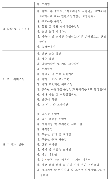 변호사업, 공인회계사업, 변리사업, 종합병원, 요양병원, 치과의원, 한의원 일반유흥 주점업, 일반 교습 학원, 예술 학원, 운전학원, 컴퓨터학원, 가전제품 소매업, 실내건축 및 건축마무리 공사업, 건강보조식품 소매업, 자동차 세차업, 중고가구 소매업, 전자상거래 소매업 등